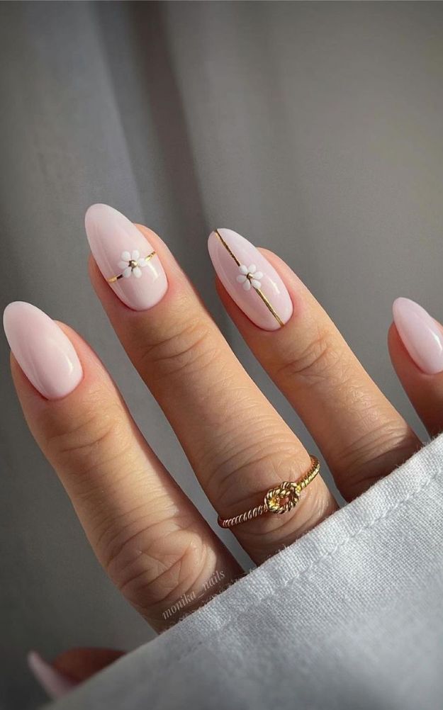 This nail style is the epitome of simple elegance, showcasing soft pink polish enhanced with delicate gold lines and tiny white flowers. The design is kept minimal, making it a timeless option for those who prefer subtle yet refined nail art. The almond shape complements the understated vibe, making it perfect for formal or professional settings.