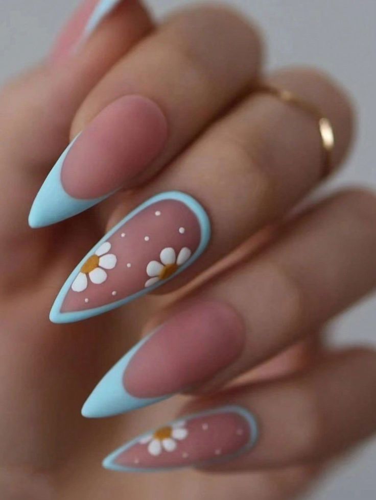 - Design Elements: Pastel blue French tips and intricate white daisy art.