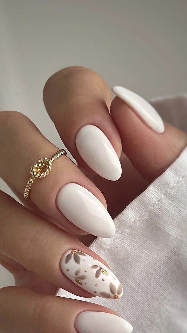 This all-white manicure with subtle gold accents is a nod to spring’s airy and light-hearted nature. The almond shape adds sophistication, while the gold leaf detailing keeps it trendy. This design is ideal for formal gatherings or a chic date night but may feel too refined for casual settings.