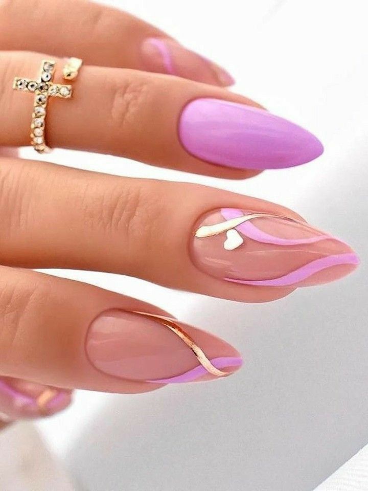 Soft lavender hues paired with thin gold accents create a dreamy, acrylic nail design. This look is perfect for adding a touch of elegance to any outfit while maintaining a minimal and modern vibe.