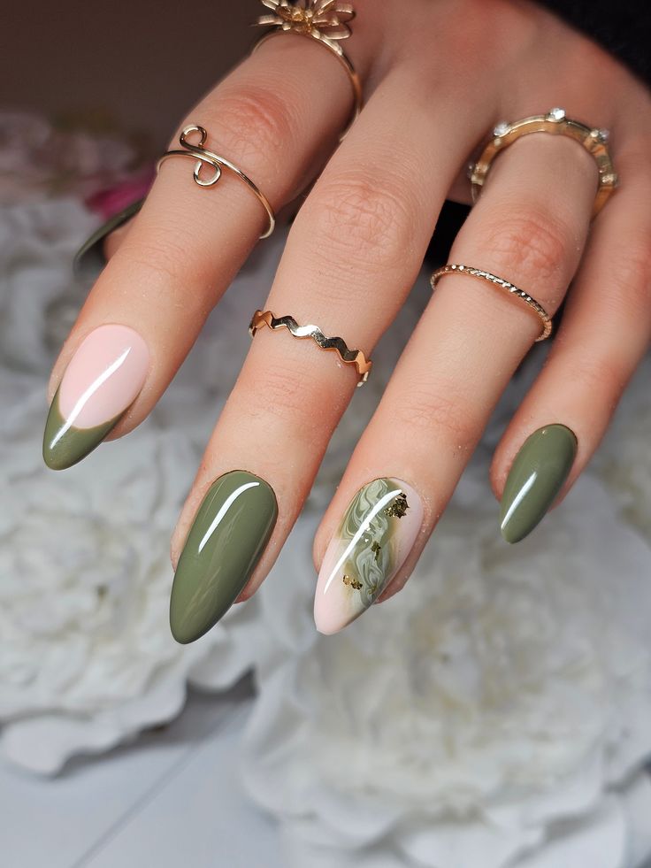 This style blends muted olive green with soft pink, creating a minimal yet sophisticated design. The marbled accent nails, adorned with flecks of gold, add just the right touch of luxury. Perfect for casual brunches or business meetings, this design is both versatile and practical. However, the muted tones may feel understated for bold fashion statements.