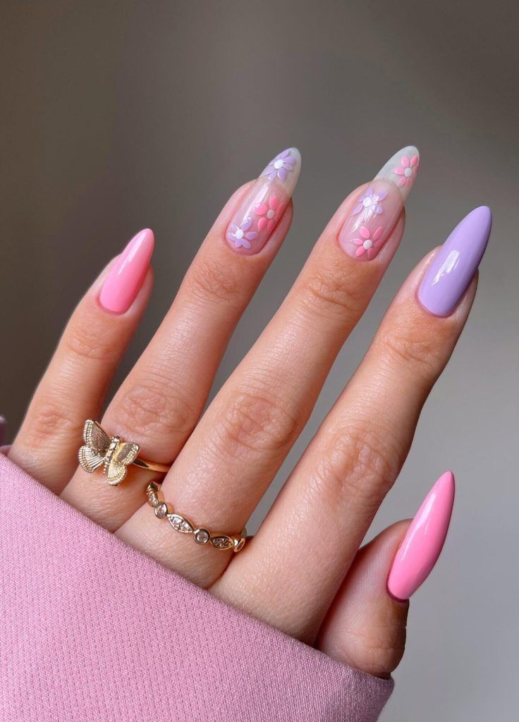 This almond-shaped manicure leans fully into spring romance with translucent bases, soft Pink and Lilac gradients, and delicate floral accents. The glossy finish keeps it modern, while the elongated shape flatters longer fingers and visually slims the hand. It’s not the most Short-friendly design, but it excels for those who love expressive, feminine details without going over the top. Ideal for brunches, garden parties, or any moment where subtle charm matters more than edge.