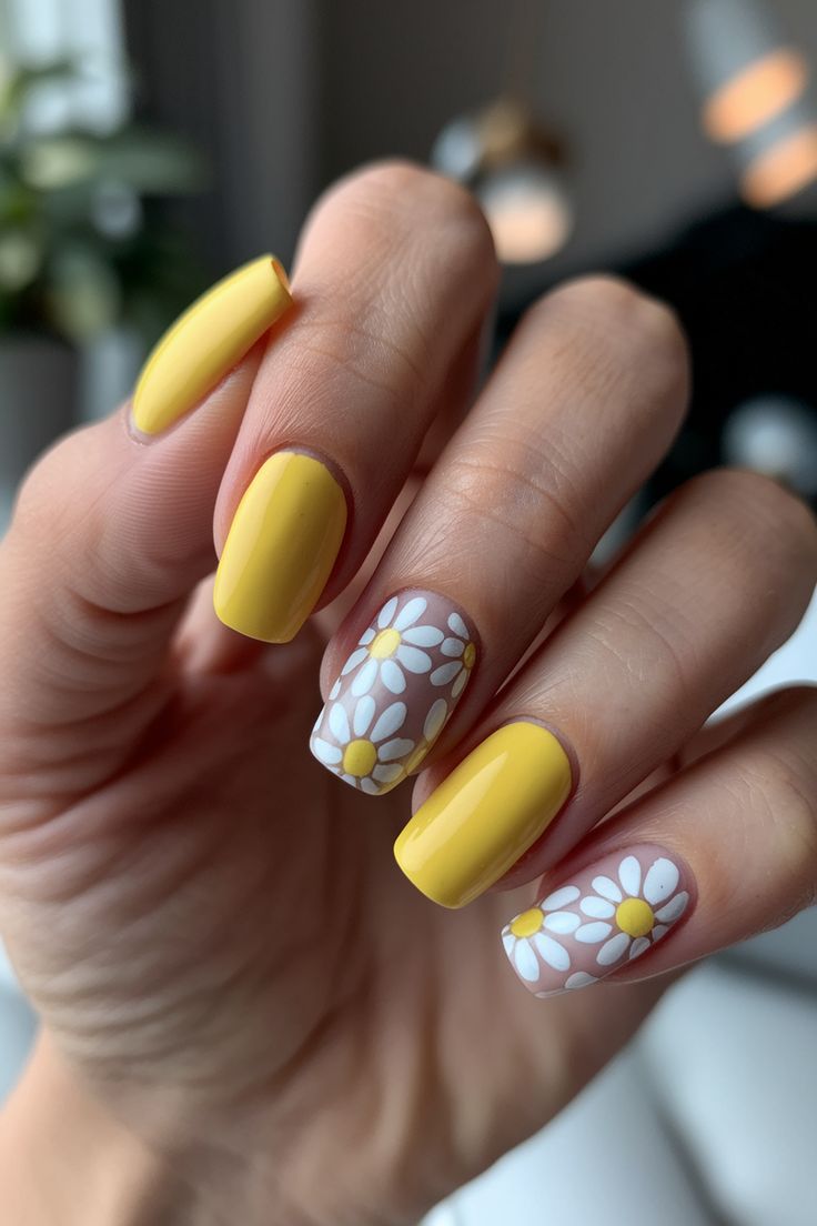 Here’s a bright, optimistic take on spring using Yellow and soft florals on a Short square shape. The translucent base keeps things light while daisy accents bring a Cute, approachable charm. This is one of those Easy, everyday manicures that works for errands, office days, and weekend brunch without feeling themed. Perfect for practical lifestyles and fans of 2025 short nail trends.