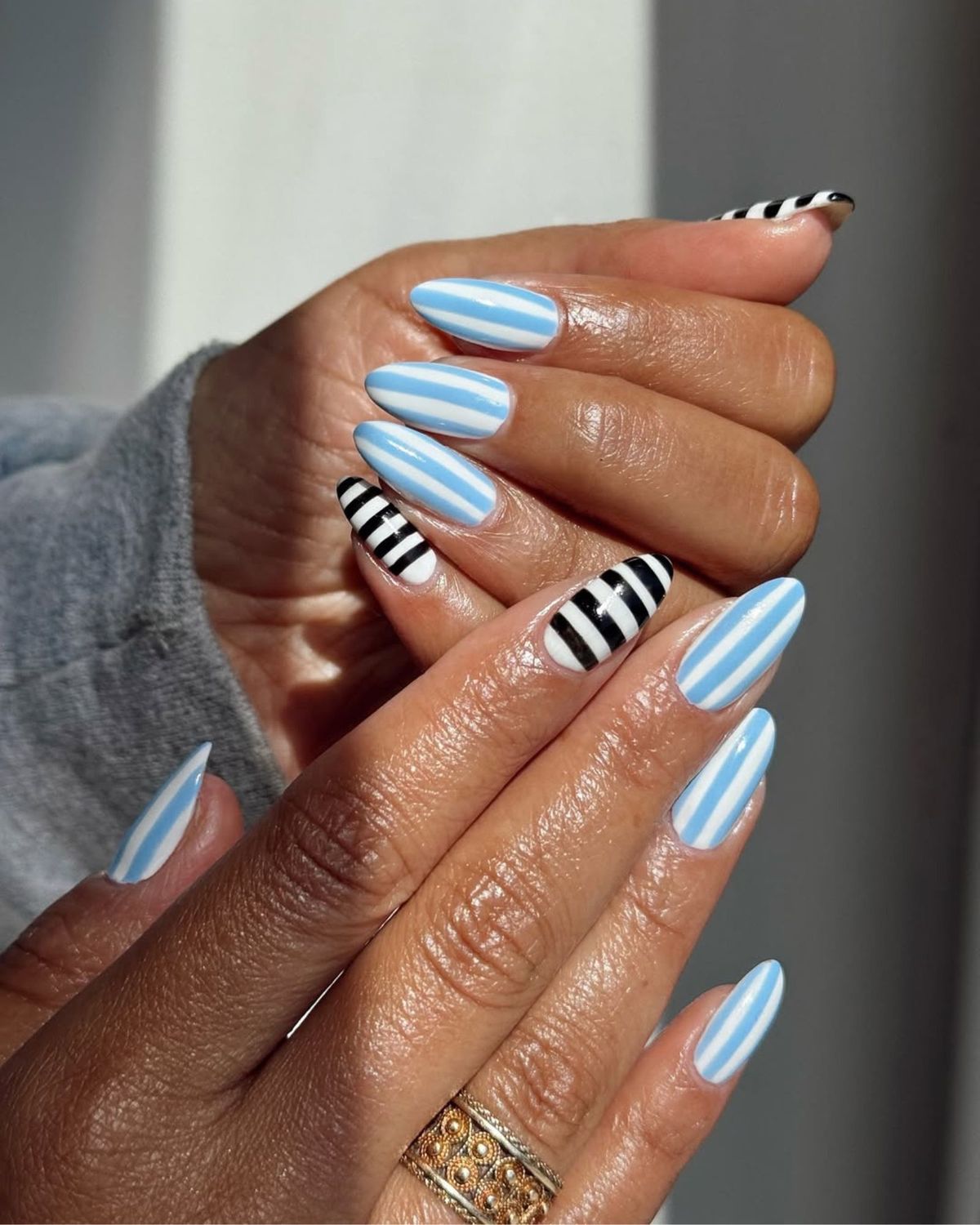 This manicure brings crisp energy with a Blue and white striped pattern paired with bold black accents. The almond shape elongates the fingers beautifully, making it ideal for wider hands or shorter fingers. It feels fashion-forward without crossing into novelty — very editorial, very now. Think gallery openings, creative offices, or fashion events rather than casual outdoor days.