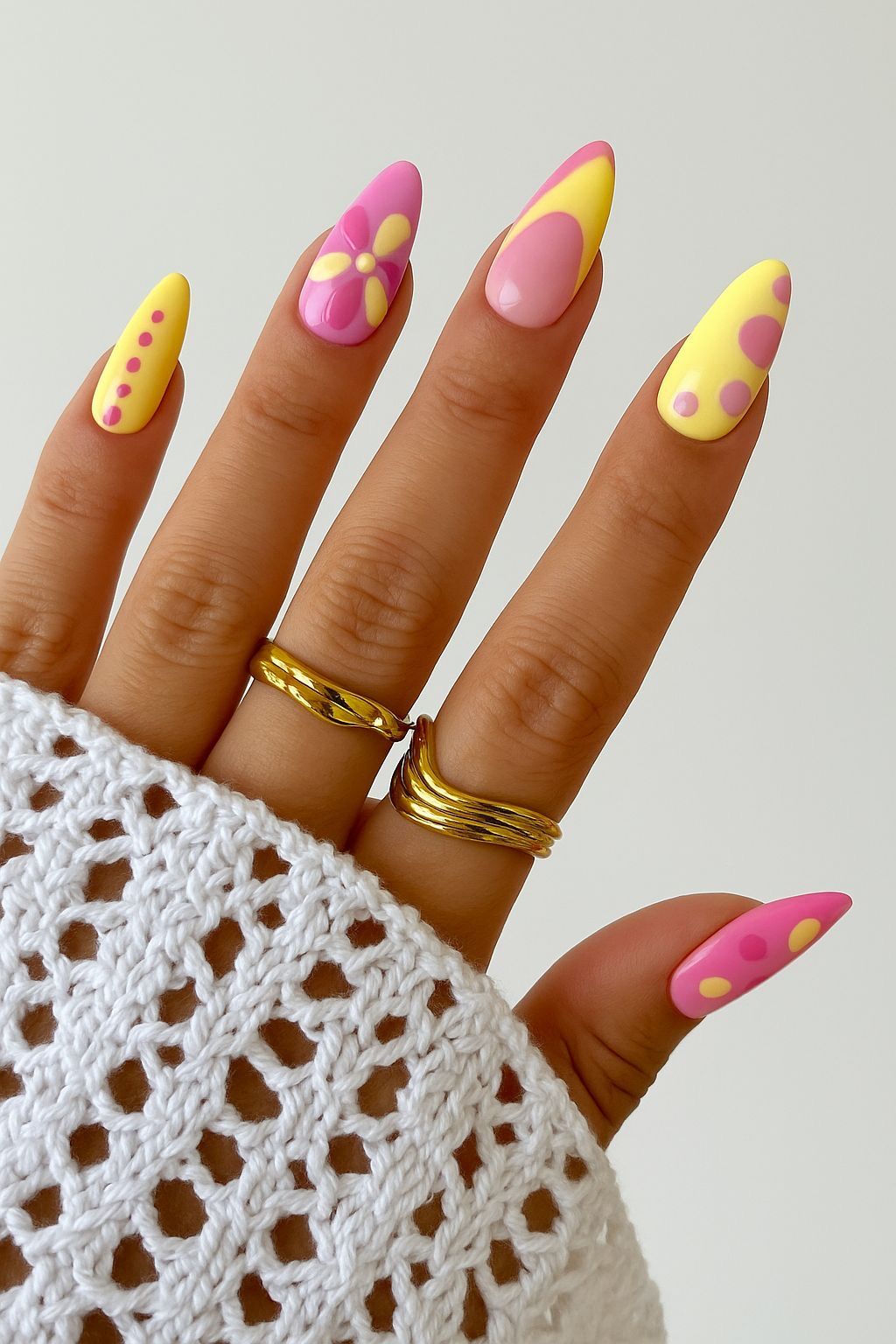 This final look leans whimsical, blending Pastel yellow and pink with raised, almost jelly-like details. The almond shape keeps it elegant, but the design itself is more expressive and fashion-forward. It’s not the most Easy or practical, but it’s undeniably fun.