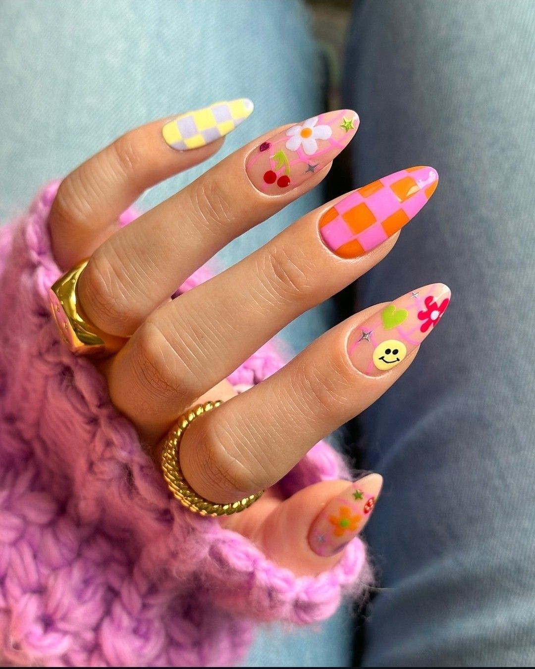 This is maximalism done thoughtfully. Checkerboard patterns, smiley faces, hearts — all anchored in a Pink-forward palette. Despite the playful elements, the almond shape keeps the look cohesive. Best for creative personalities and casual spring days.