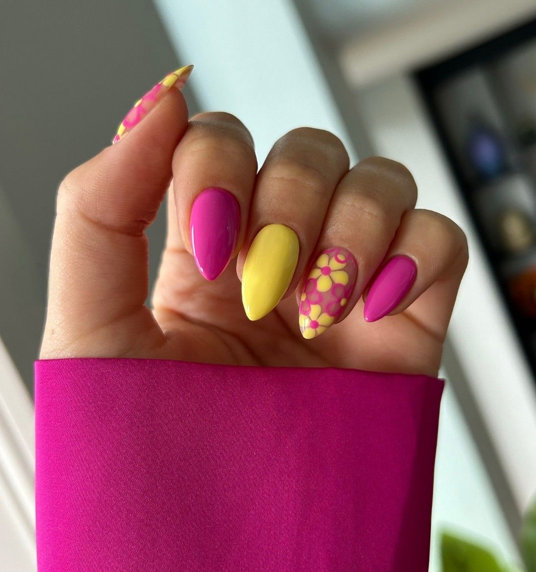 Solid Pink and Yellow with Floral Accent Nail