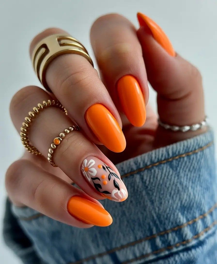 Bright Orange Almond Nails with Floral Accent