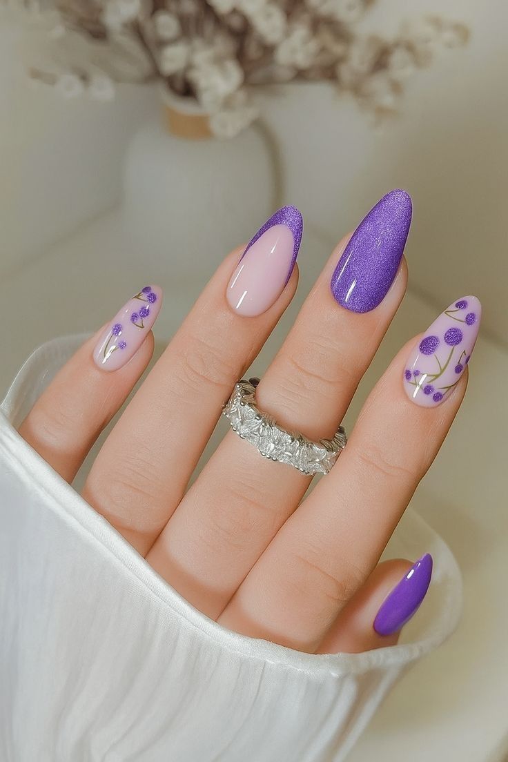 Lilac shows up every spring, but this version feels especially refined. A soft Lilac base mixed with delicate botanical accents gives this manicure a romantic, almost editorial quality. The almond shape keeps things elegant, aligning neatly with 2025 oval and almond crossover trends. This is a beautiful choice for events like spring weddings, brunches, or any moment where you want polish without drama.