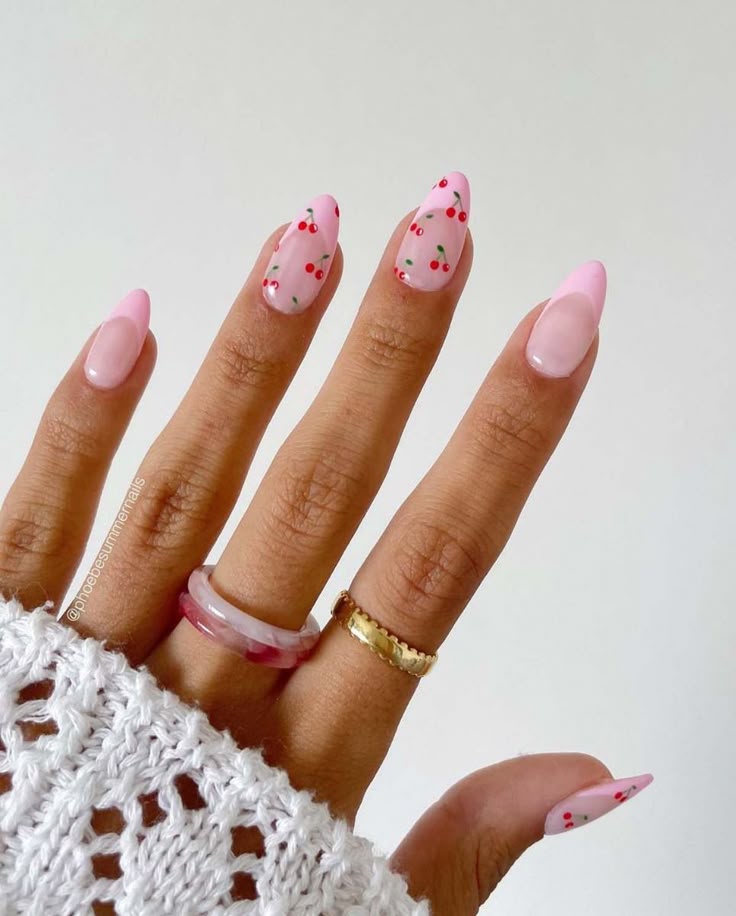 Pink Almond Nails with Cherry Accents