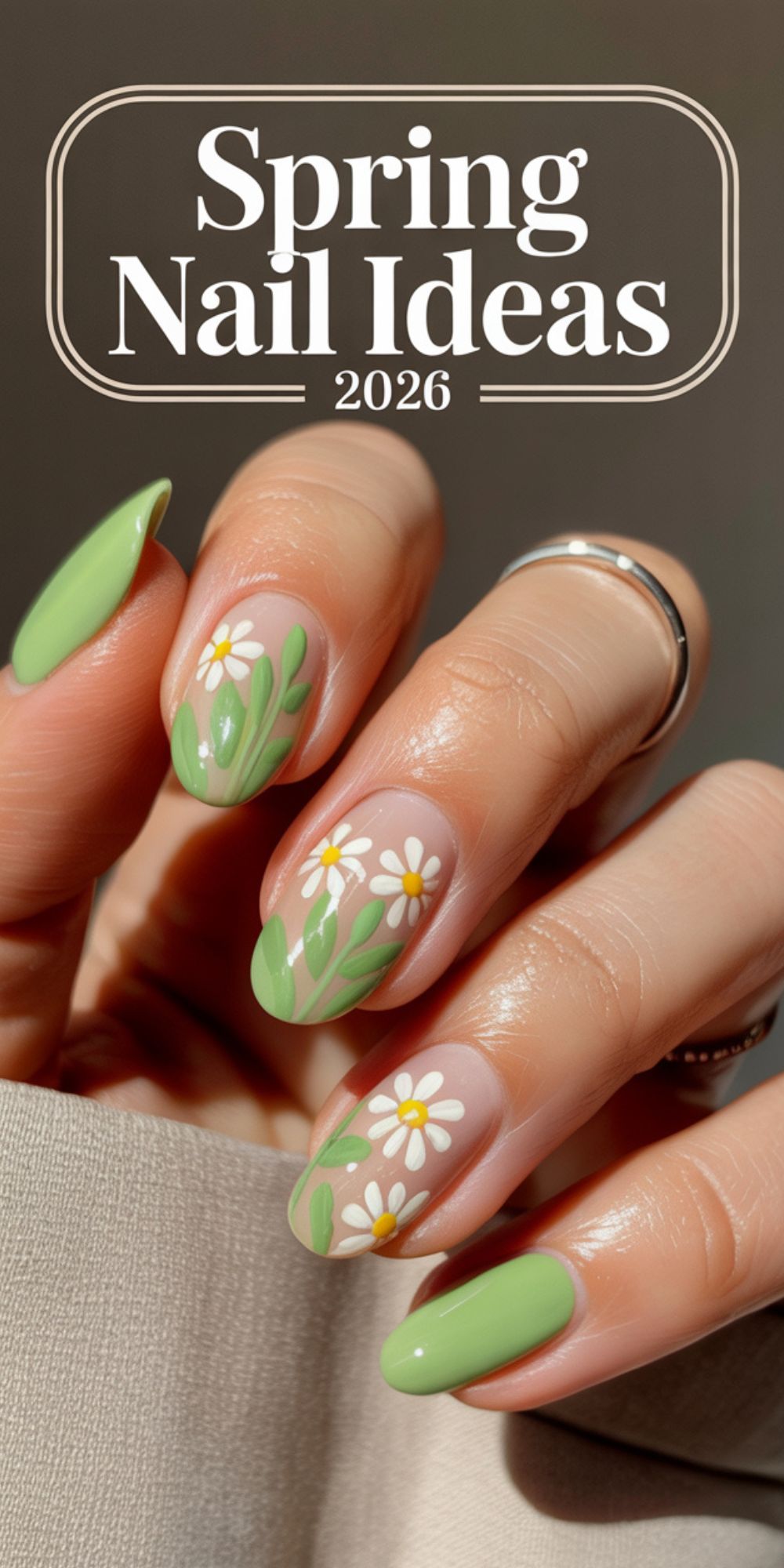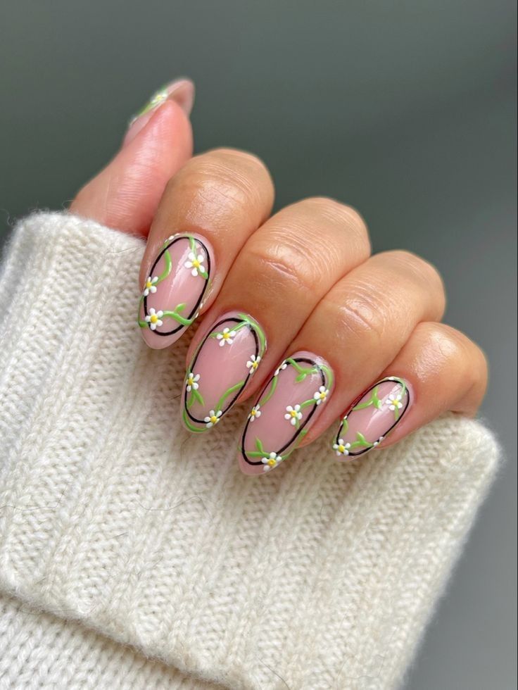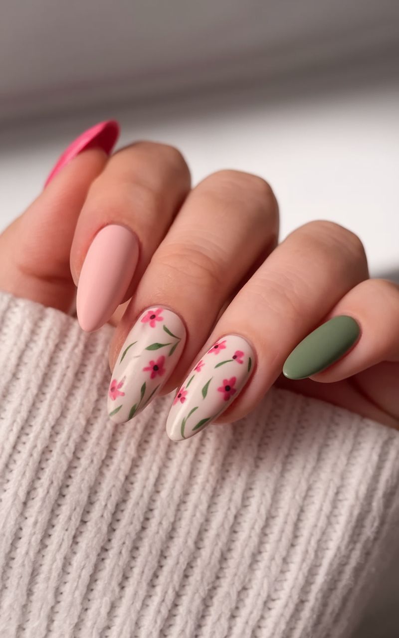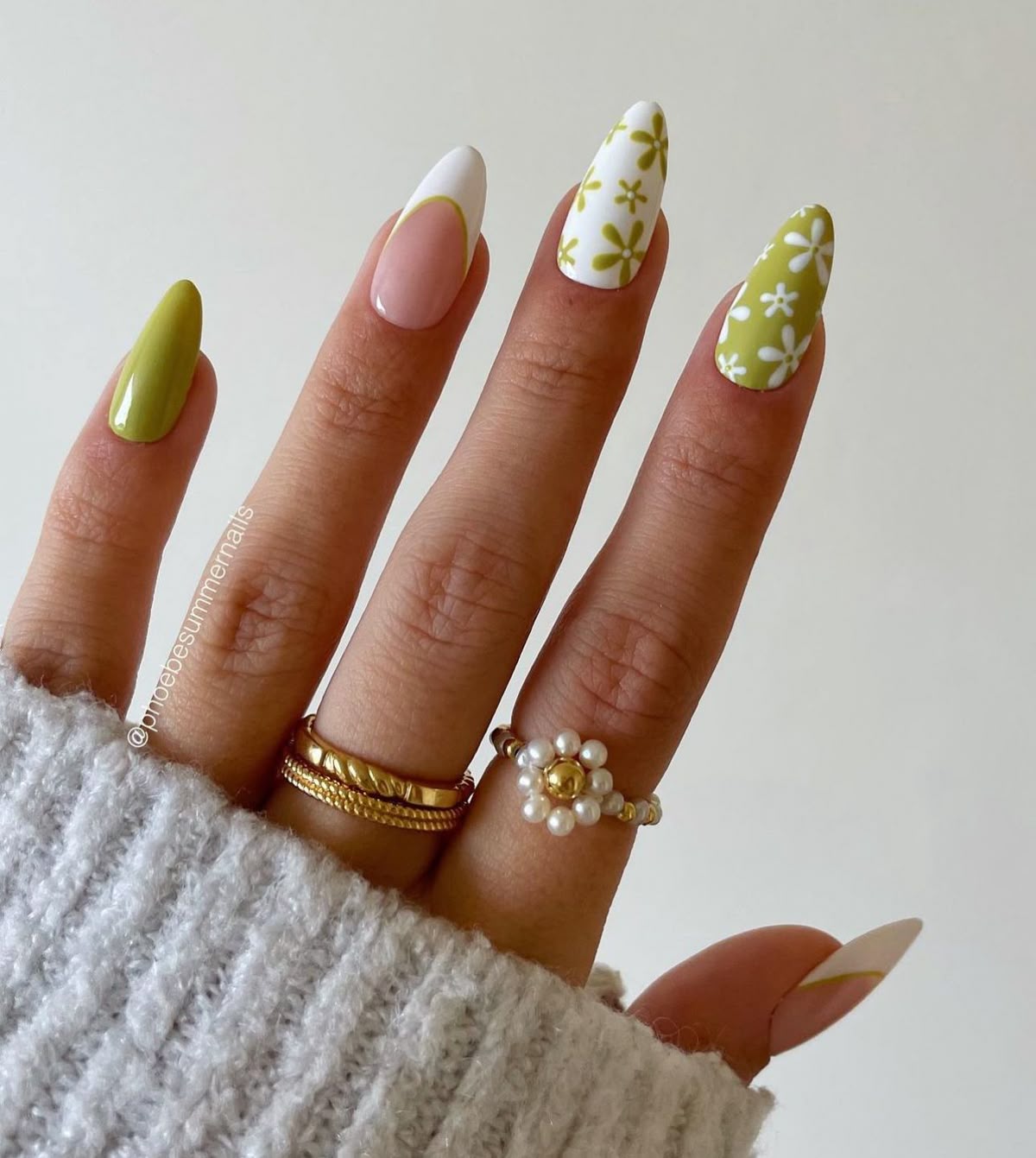 This design leans into a calm, nature-inspired Green palette with almond-shaped nails that feel elegant without being precious. The muted olive polish paired with white floral detailing and a soft French tip variation creates a look that’s quietly sophisticated. Gold rings and cozy knit textures support the aesthetic, making this manicure ideal for relaxed spring wardrobes rather than high-drama styling. This shape works beautifully for medium to long fingers, while very short nail beds might lose some of the floral impact.