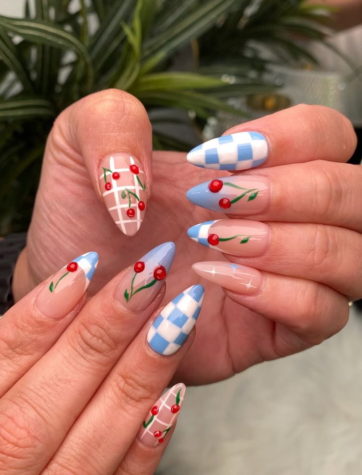 This set brings picnic-core straight into 2026 with soft Blue gingham patterns and cherry motifs layered over a translucent base. The almond shape adds elegance, preventing the design from feeling juvenile. It’s playful, but not chaotic—ideal for spring vacations or creative work environments.