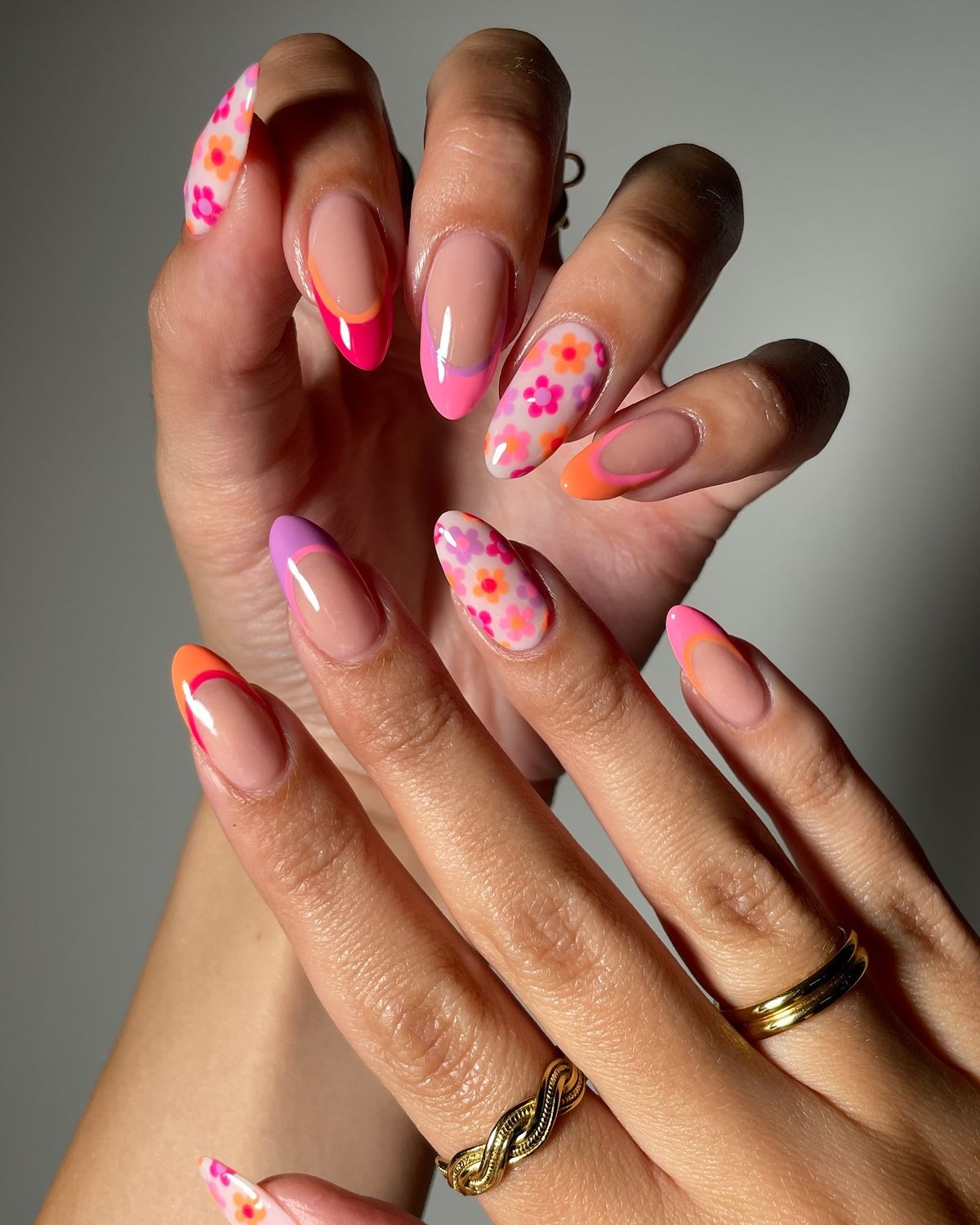 A modern French tip revival done with confidence. Bright pinks, oranges, and lilacs outline the tips, paired with floral accent nails that add dimension without stealing focus. This is playful spring energy with structure—ideal for those who want color but still crave polish.