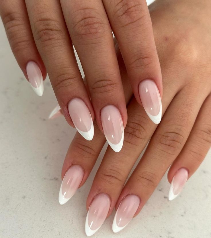 These nails feature an elegant almond shape with classic white tips. This simple yet sophisticated design is perfect for those who prefer a timeless look. The clean lines and subtle curvature of the nails make them suitable for various occasions, from a casual day out to a formal event.