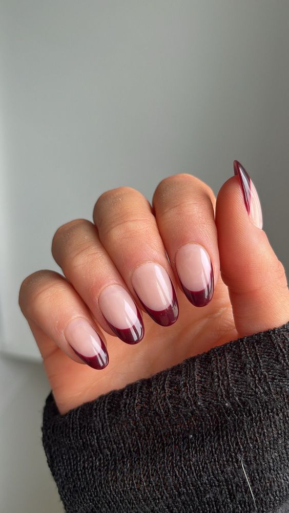 Deep burgundy French tips bring a touch of sophistication and mystery to your nails. This color is quintessential for fall, offering a rich, warm tone that complements the season.