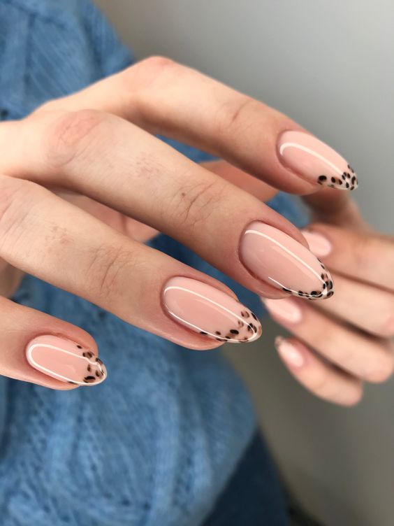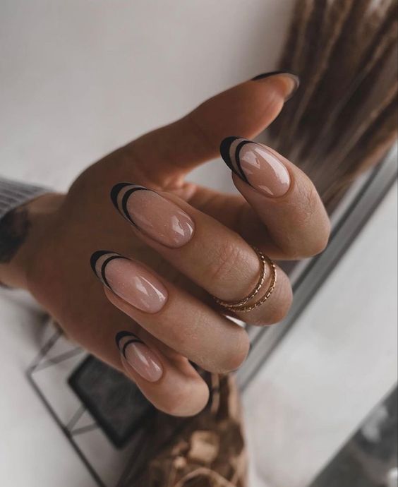 This design brings a modern twist to the French manicure with black tips on almond-shaped nails. The contrast between the natural nail color and the black tips creates a striking and contemporary look, perfect for autumn.