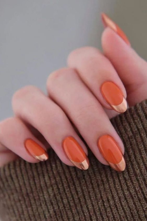These nails feature a bold orange base with metallic tips, offering a vibrant and energetic look for fall. The combination of orange and metallic hues is perfect for those who want to make a statement with their nails.
