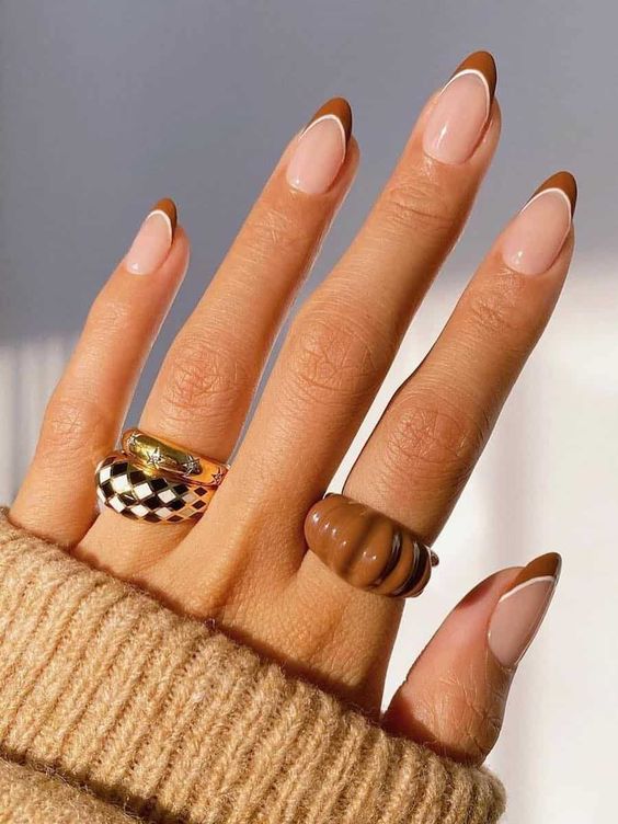 These nails feature dual-colored French tips in earthy tones, providing a sophisticated and grounded look. The combination of neutral colors makes this design versatile and appropriate for various settings.