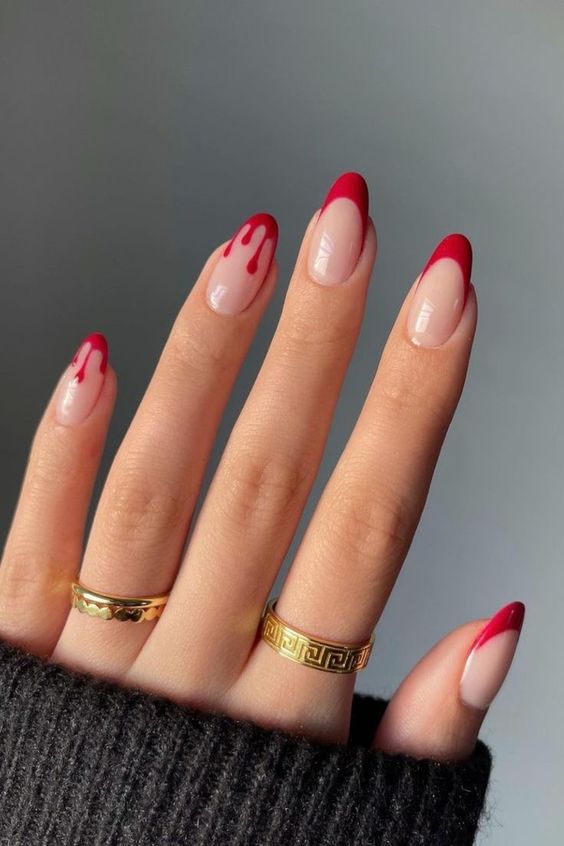 These nails feature a festive red French tip with a dripping effect, adding a playful and creative twist to the classic design. The dripping effect makes this design stand out, perfect for those who love unique nail art.