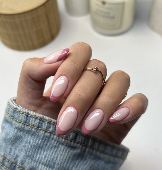 This manicure exudes subtle sophistication with its delicate blend of blush pink and mauve French tips. The rounded almond shape enhances the fingers’ natural elegance, making it a versatile look for various settings.