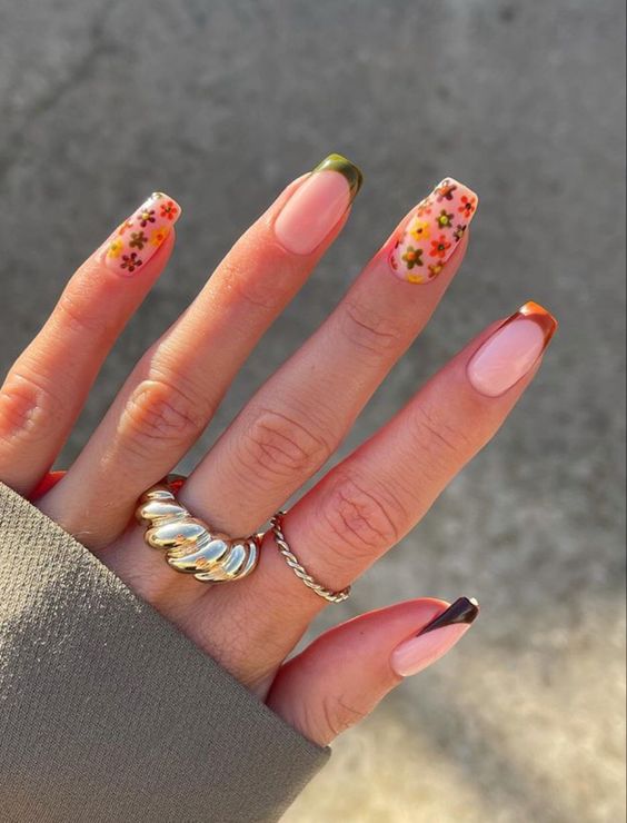 This nail art combines the classic French tip with fall-inspired floral designs. It’s perfect for those who want a simple yet unique look for Halloween. The mix of green, orange, and nude colors is both subtle and stylish.