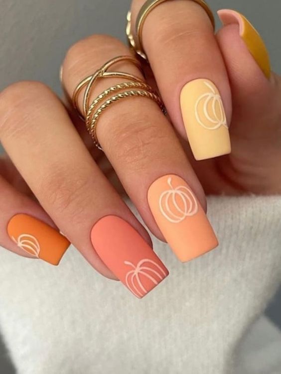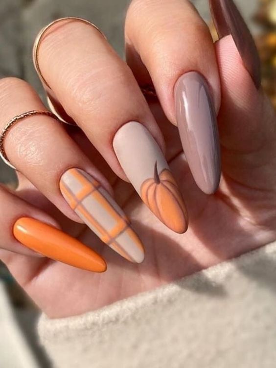 Nothing says fall like pumpkin-themed nail art. This design features various shades of orange and beige with detailed pumpkin and plaid patterns, making it a perfect match for cozy fall outfits.