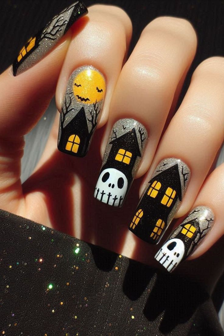 For a more edgy and spooky look, this nail art combines skulls and graffiti. This design is perfect for those who want to make a bold statement with their Halloween nails. The black and white color scheme keeps it classic yet striking.