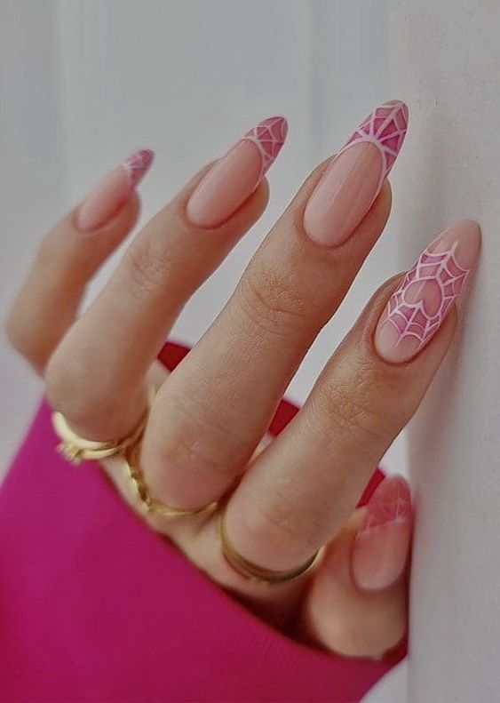 Imagine nails that perfectly capture the essence of Halloween with a touch of elegance. These spider web nails feature a nude base with intricate pink spider web designs, making them a cute yet spooky choice for your Halloween look.