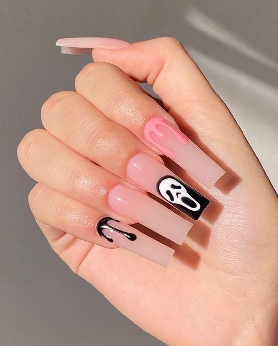 These nails scream Halloween—literally! Featuring a mix of pink and black dripping designs with a classic Scream mask, this nail art is spooky, unique, and perfect for making a statement.