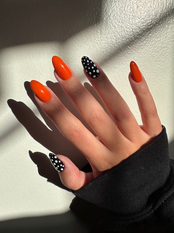 For those who prefer something a bit more playful, these nails feature a vibrant orange paired with black polka dots. This simple yet effective design is perfect for those looking for a cute and easy Halloween manicure.