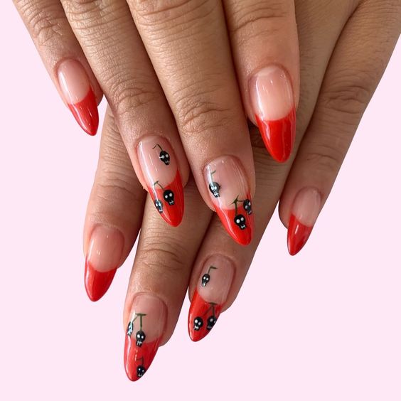 These nails bring a red hot twist to Halloween. With a clear base and fiery red tips adorned with tiny black skulls, this design is both spooky and stylish, making it a perfect choice for a bold statement.