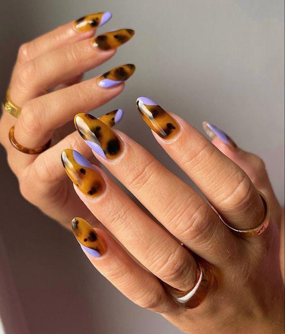 For those seeking a sophisticated yet unique Halloween nail design, these tortoiseshell nails with lavender accents offer a chic and elegant option. The mix of earthy and pastel tones makes it perfect for fall.