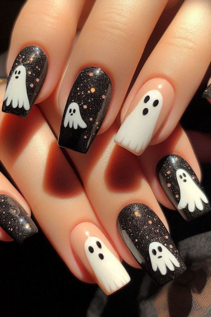 For a truly spooky effect, try these nails featuring white ghosts on a black and glittery background. This design is both cute and simple, perfect for creating a mysterious vibe.