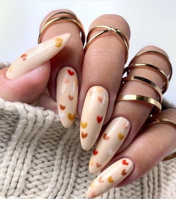 If you want to keep your Halloween nails subtle yet festive, these nails with delicate heart motifs in fall colors are perfect. They are easy to do and offer a unique twist on traditional Halloween designs.