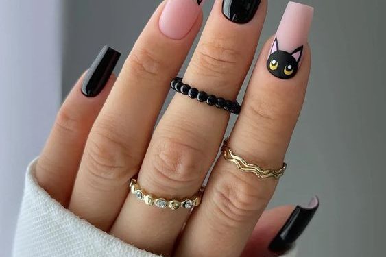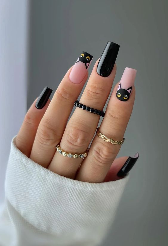 This nail design is perfect for anyone who loves a mix of cute and spooky. The black cat motif is a classic for Halloween, and it looks absolutely adorable on a pastel pink and black base. This design features a combination of black and pink nail polish, with a detailed black cat face on two nails.
