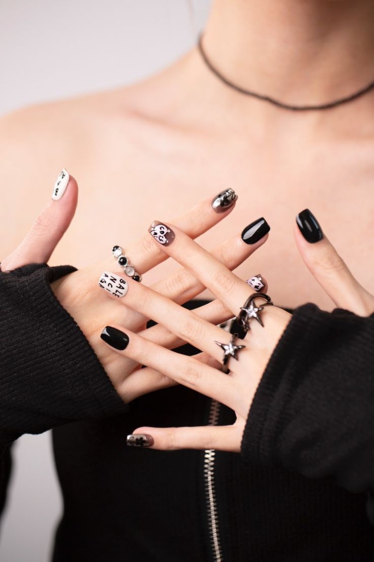 Pair these nails with an edgy outfit like a leather jacket and black jeans to enhance the spooky vibe. Keep accessories minimal to let the nails be the focal point. Adding some temporary Halloween tattoos could also be a fun way to complete your look.