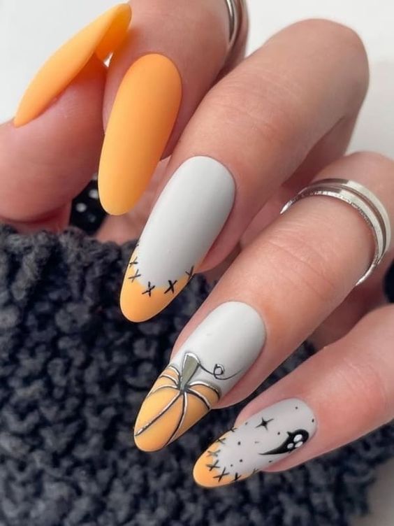 This cute nail art design is inspired by the classic pumpkin patch. It’s perfect for those who want a fun and fall-themed look without being too over-the-top. The orange and grey color scheme is both festive and versatile.