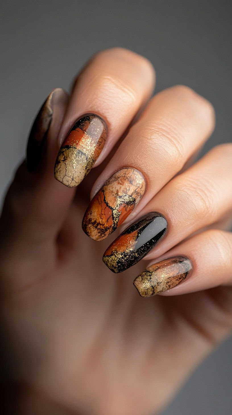 This is the boldest version yet—sharp almond tips dipped in fiery tortoise shell shades. The high-gloss finish makes them look almost molten. Best for statement moments: parties, nights out, or fashion events. This design isn’t the most practical for typing-heavy jobs, but it is perfect for glam occasions.