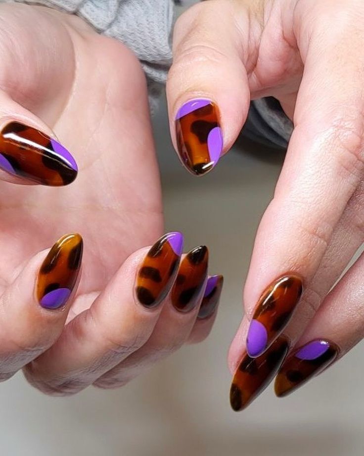 This design takes the earthy warmth of tortoise shell and collides it with a daring pop of violet. The almond-shaped nails balance the deep amber and chocolate tones with a futuristic edge. This look works beautifully for medium to long nails—it elongates the fingers and creates a playful, high-fashion vibe. Perfect for fashion events or a night out, but perhaps too loud for ultra-formal office settings.