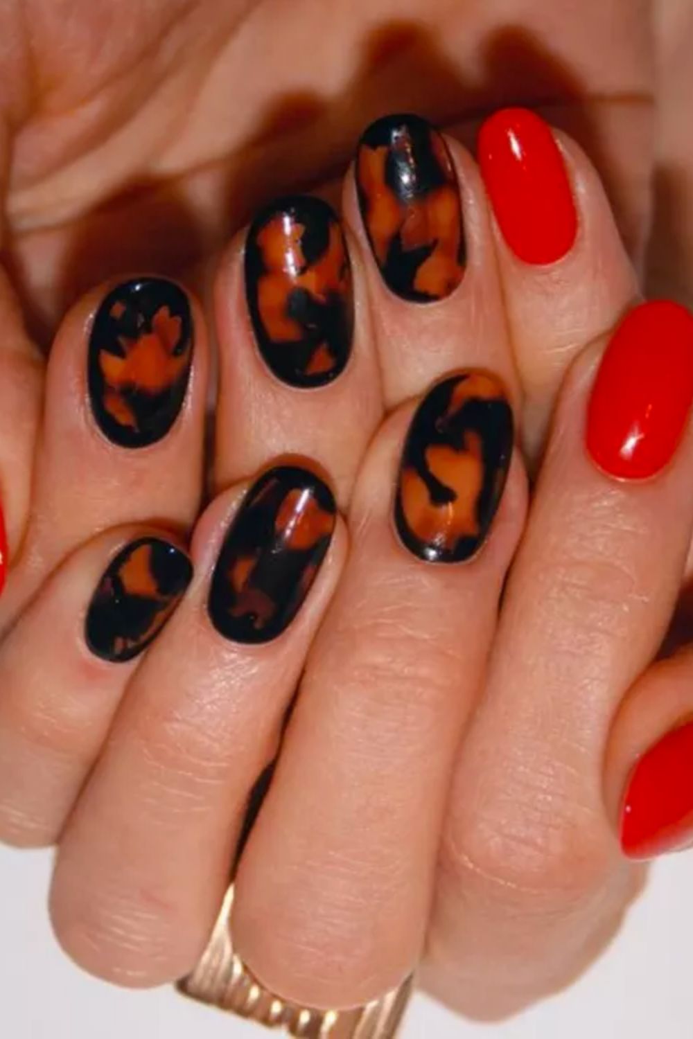 This design dares to mix fiery red with tortoise accents. Alternating nails keep it from being overwhelming, while the oval shape softens the bold color clash. This look feels modern and fashion-forward, suited for confident personalities who want nails that demand attention. Perfect for evenings, parties, or anytime you want to stand out.