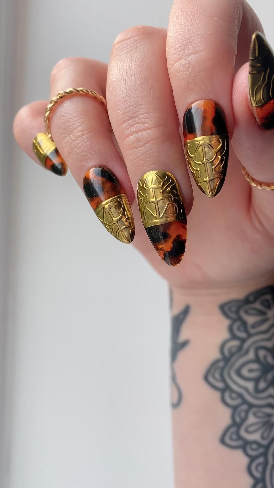 This is tortoise shell reimagined as luxury armor. The gold metal accents bring a sculptural, 3D effect that feels almost regal. It’s a bold choice, ideal for special events, photoshoots, or moments when you want nails to feel like jewelry.
