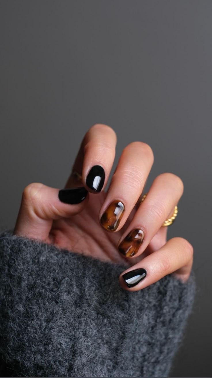 For those who love depth, this smoky black-and-amber blend is a showstopper. The almond shape stretches the fingers, while the darker edges give a cat eye illusion that’s magnetic under the light. It’s a sultry design, perfect for evenings, date nights, and fall fashion moments.