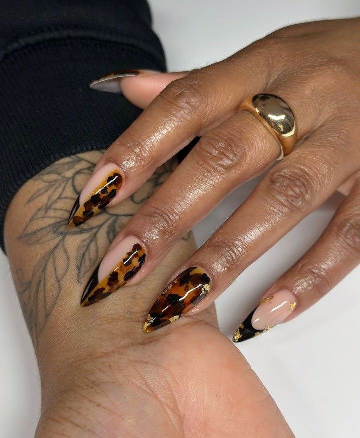 A more intricate set, blending tortoise shell, nude, and gold flecks on almond-shaped nails. It’s striking and artistic, meant for someone who enjoys designs that draw attention. Great for nights out, weddings, or occasions where you want your nails to be a conversation starter.