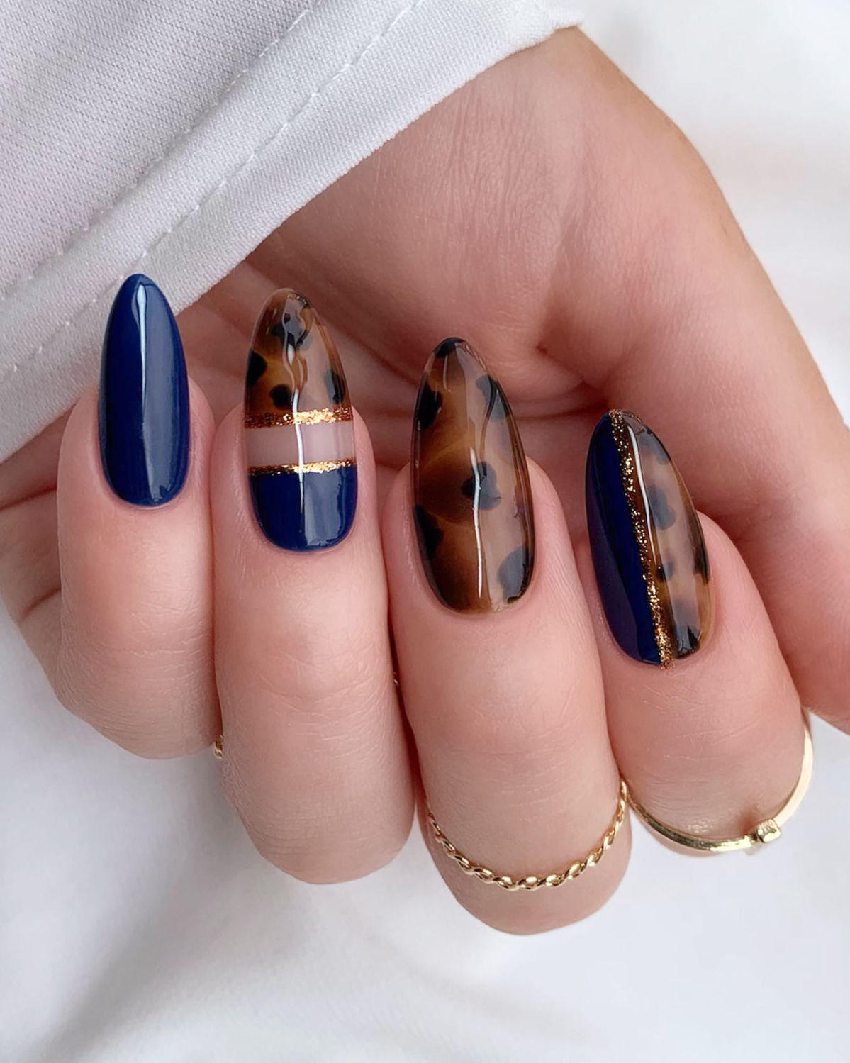 Combining tortoise nails with deep blue polish creates a modern contrast. The almond shape adds femininity, while gold stripes give a luxe accent. This design feels perfect for fashion-forward professionals or those attending evening events.