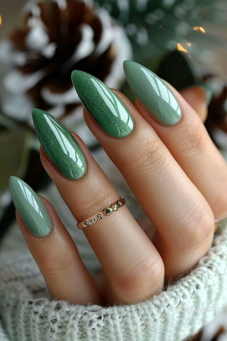 Emerald green nails are a bold, festive choice for Winter 2025, bringing in a touch of glamour. The deep green base is adorned with a subtle sparkle, making it perfect for the holiday season. This gel manicure shines with a sophisticated, jewel-like finish, offering the perfect pop of color against neutral winter wardrobes. The almond shape works wonderfully to elongate the fingers, while the glossy, sparkling top coat ensures these nails catch the light with every movement. It’s the perfect style for a holiday party, though it may be too bold for conservative work environments.