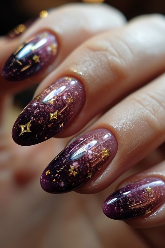 - Starry glitter accents: Gold star-shaped glitter pieces add a touch of whimsy to the nails, evoking a starry night sky and adding some extra sparkle.