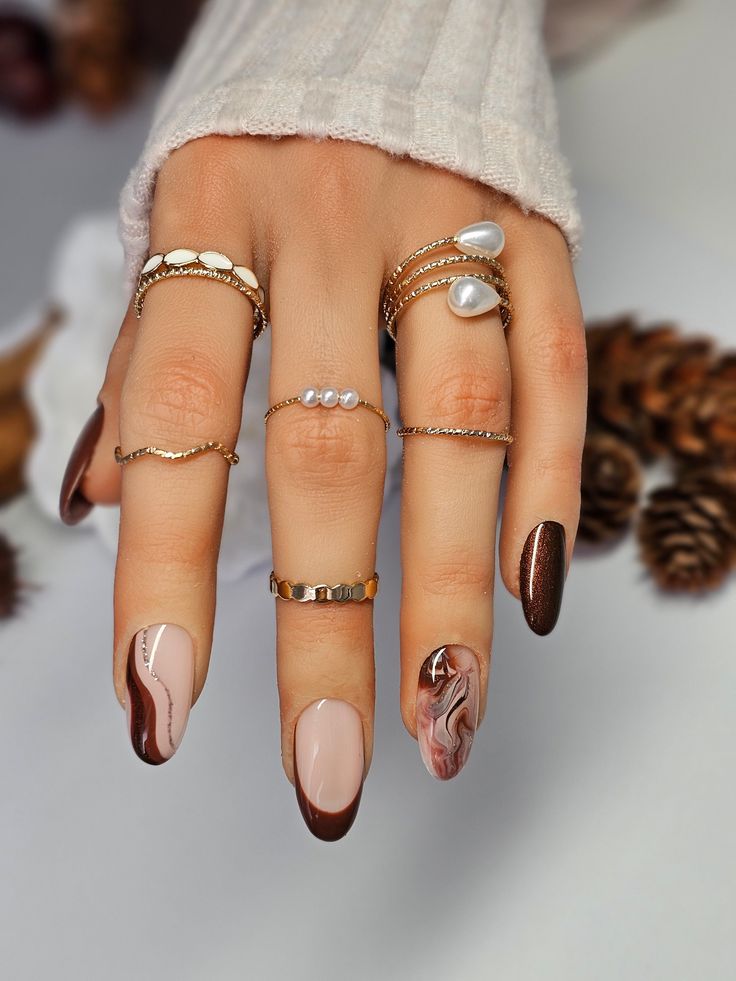 This warm and trendy gel short style plays with various shades of brown and soft white waves, bringing depth and dimension to the nails. It’s a creative yet understated option for those who want to experiment with patterns but keep their nails classy.
