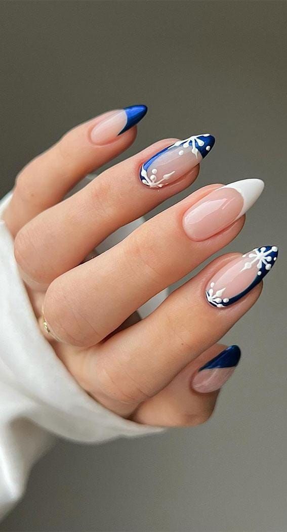 This look combines almond shape nails with a striking blue French tip design kissed by delicate white floral accents. It balances classy elegance with seasonal charm, making it an ideal choice for winter holidays or evening gatherings. The elongated tips flatter slimmer fingers, but may not be the best option for very short nail beds, as the bold tips can exaggerate length. Think cocktail parties, winter weddings, or even office holiday soirées—this set works almost everywhere except ultra-casual, hands-on settings where the pointed shape might feel impractical.
