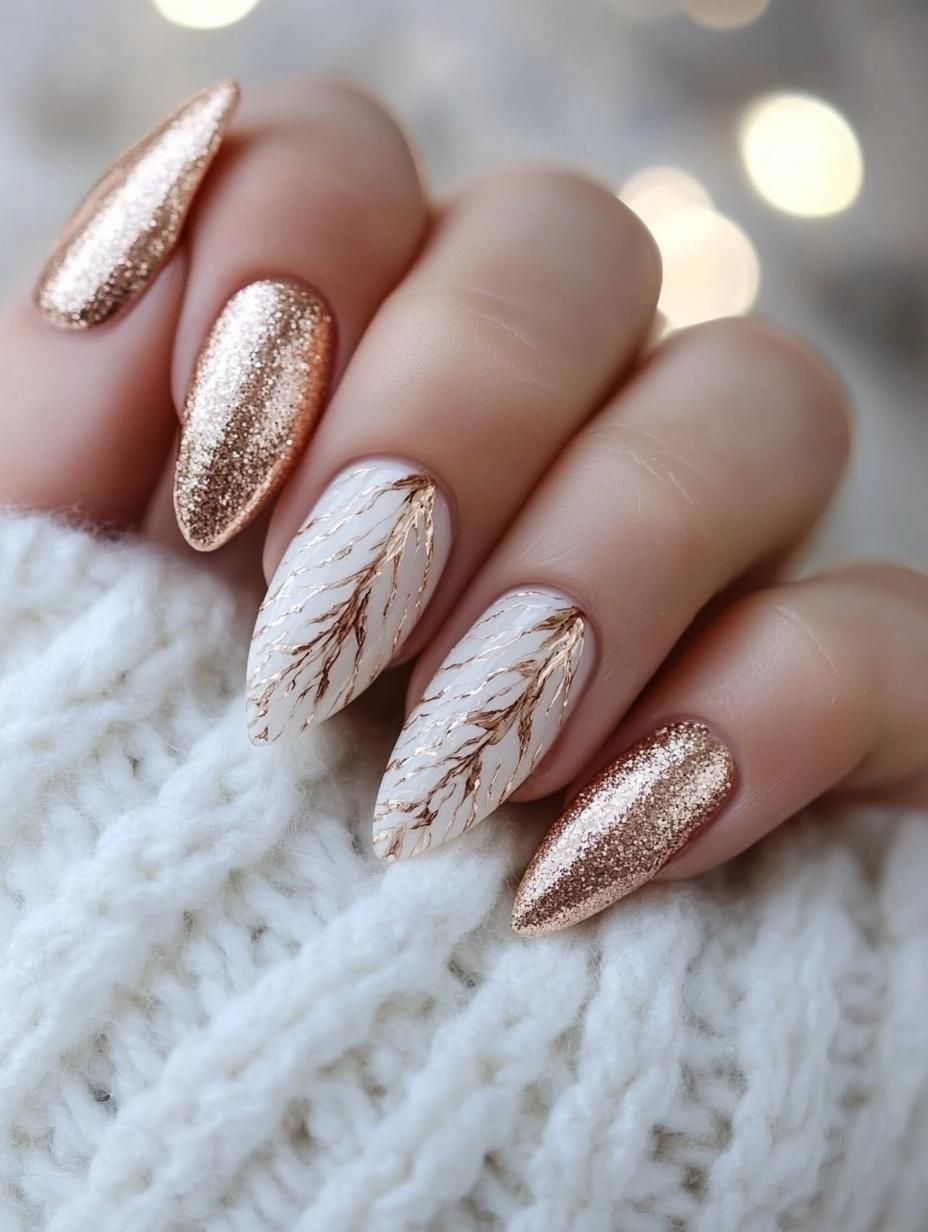 This set is everything: elegant, festive, and perfect for holiday dinners or New Year’s Eve parties. The almond shape looks luxe and feminine, while the mix of full-on glitter and delicate metallic leaf patterns creates balance. This design works beautifully for those who want something classy yet celebratory. It might not be the most minimalist choice, but it definitely ticks the box for trendy statement nails in 2025.