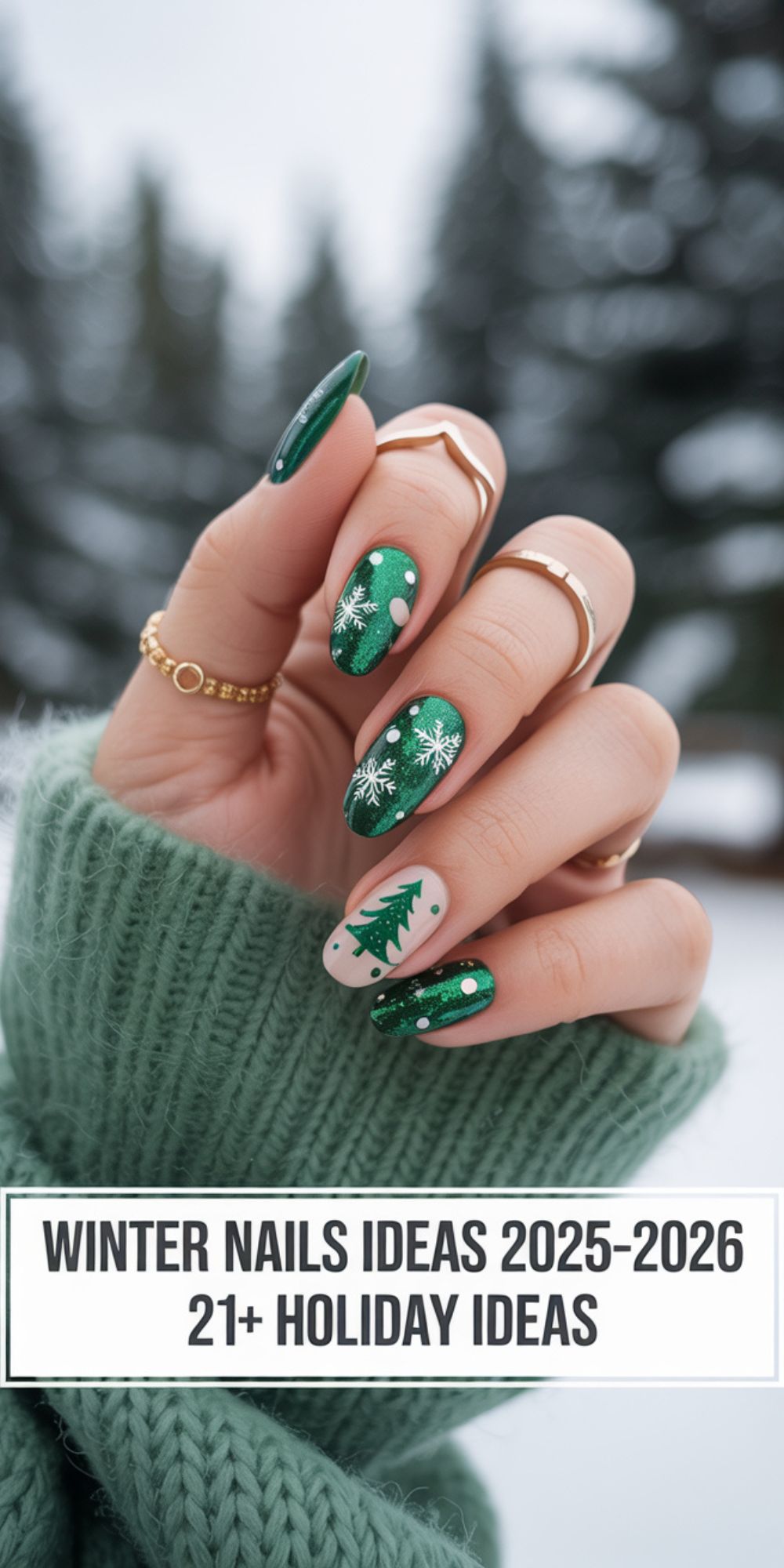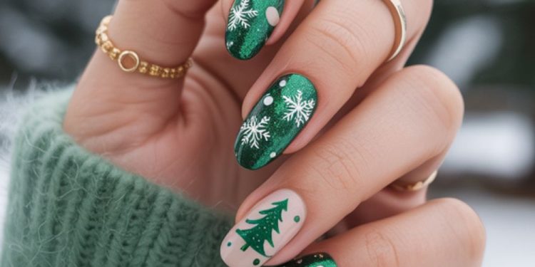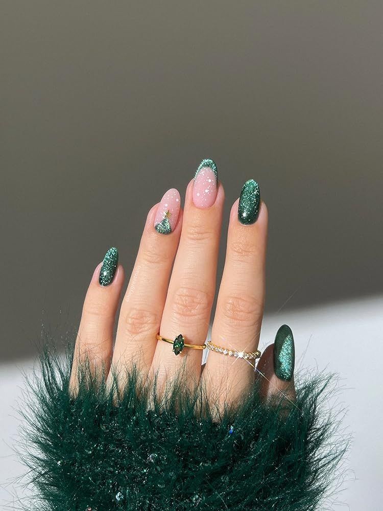 Nothing says winter quite like a rich forest green. These nails are playful and festive with glitter accents and even a tiny Christmas tree detail. The almond shape makes them look classy despite the fun seasonal vibe. These would be perfect for holiday parties, cozy gatherings, or even just to keep yourself in a festive mood. They might not be the most simple choice, but they’re definitely one of the cutest trendy designs this season.